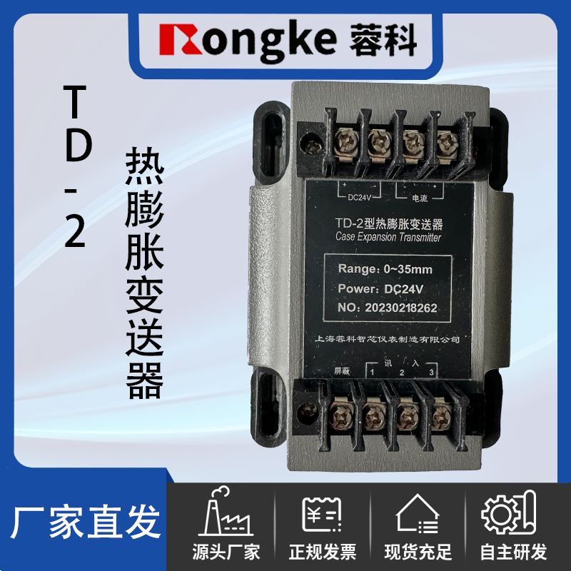 TD-2型热膨胀变送器.蓉科是针对电感位移传感器而设计的产由振荡器、桥式检波器、滤波器和直流放大器构成,具有性ID能稳定,抗干扰能力强,调节方便等优点。变送器供电电源为直流 24V,经稳压、由振荡器产生稳定的中频信号供给位移传感器并将检测到的变量讯号经检波,放大远距离输出4~20mA 对应位移量的变量电流,如在终端串接250欧电阻,在电阻两端可检测到1-5V对应变量电压。