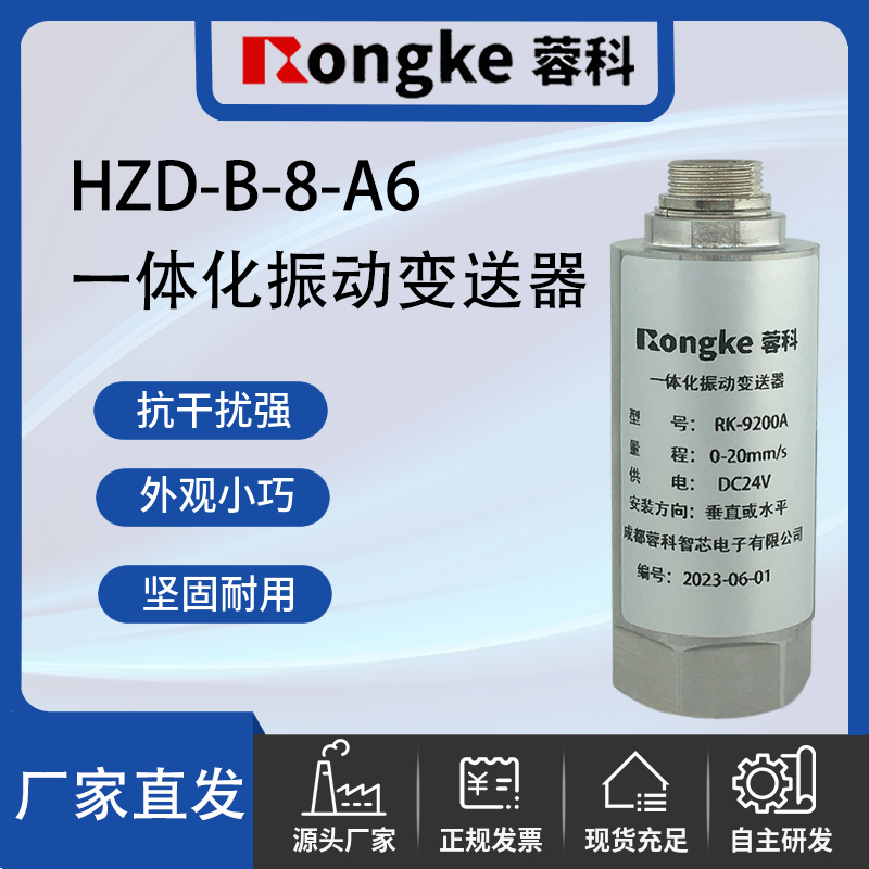 蓉科/一体化振动变送器 HZD-B-8-A6:将磁电式振动传感器、精密测量电路集成在一起,构成高精度振动测量系统,该变送器可直接连接DCS、PLC或其它设备,是测量风机、电动机、水泵等工厂设备振动的理想选择。