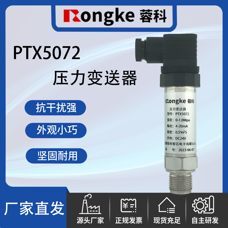 蓉科/PTX5072压力变送器:采用316L/304材质扩散硅压力芯体作为敏感元件,内置处理电路,经过计算机自动测试,并用激光调阻工艺进行了宽温度和灵敏度补偿,将传感器毫伏信号转换成标准电压﹑电流信号输出,可直接与计算机、控制仪表﹑显示仪表等相连。选用高稳定性和高可靠性的压阻式压力传感器和高性能的变送器专用电路,整体性能稳定可靠,可进行远距离信号传输。