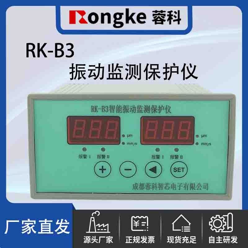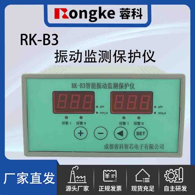 RK-B3振动监测保护仪:振动监测保护仪主要用于对转速600~60000转/分旋转机械的振动烈度进行长期监测,与磁电式振动速度传感器配套,可以监测旋转机械的垂直、水平方向的振动,振动烈度值大小由仪器前面板的表头显示,同时具有标准的电流输出,可与各种DCS、PLC系统配接,当振动值超时,本仪器可外接声光报警器以提示现场操作人员采取防范措施,并有报警、危险开关量输出,保护机器安全可靠运行。