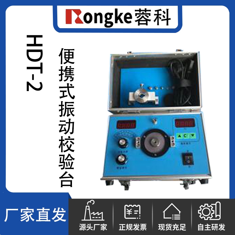 HDT-2型便携式振动校验台是由可调信号源、功率放大器、悬浮振动机构、标准振动传感器、单片机测量与显示系统组成,并将它们集成在一个小铝合金箱体内,一人既可轻松携带,可用于工业现场或实验室。