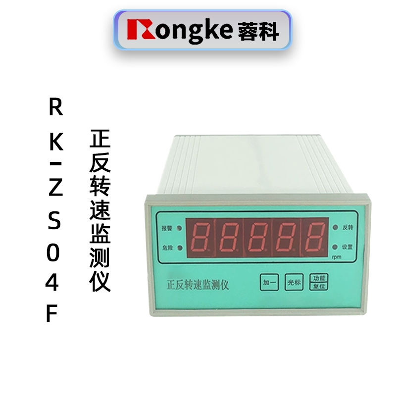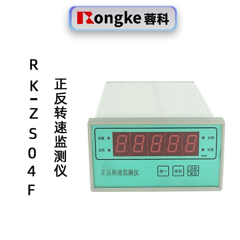 RK-ZS04F正反转速监测仪:智能正反转速表对机器的轴的反向旋转进行识别和保护,是在对机械的转速监测中同时进行的,它可以接收两路转速传感器提供的相位进行对比而做出方向判断。它既具有转速测量,又提供反转保护。仪表的输入信号来自两路转速传感器,非接触传感器的探头沿径向以适当间隙安装在轴系凸或凹槽或测速齿盘处,正对着感应体,两支传感器成一定的夹角安装,对机器的测速盘或测量齿的模数、齿数、齿的分布有一定的应用要求。